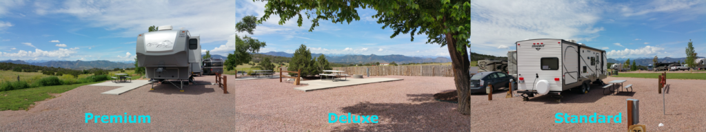 Premium Plus RV Site 40’x 70’ landscaped site, best views, full-hookups (30 and 50 amps),concrete patio, level parking with fire pit and table. Premium plus spaces are farthest off the road and feature no neighbor on one side, or is a large pull-thru.