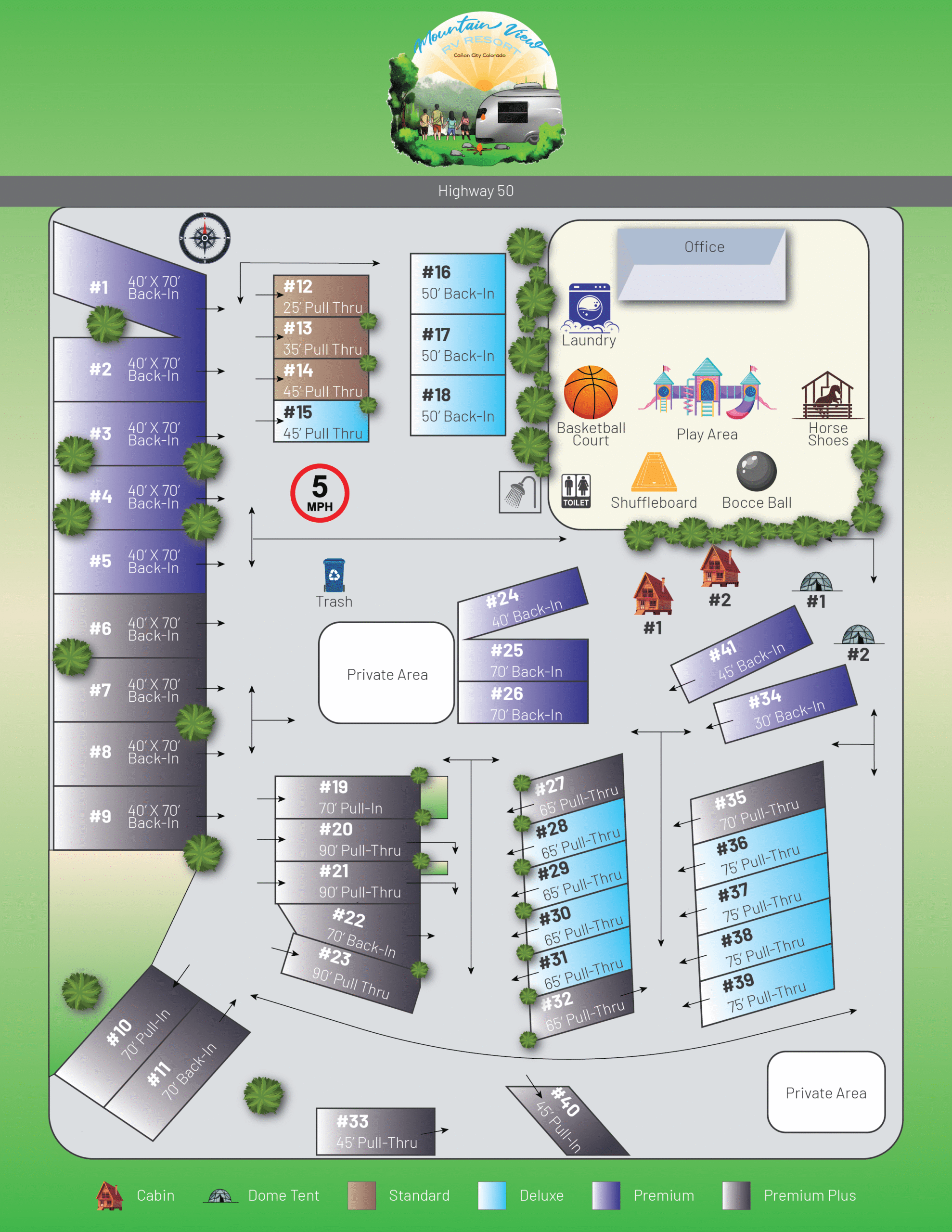 Note: Route 50 at the top of the map is on the north side of the resort. The Sangre de Cristo mountains are to the southwest and sites at the southern end of the park have the best views.