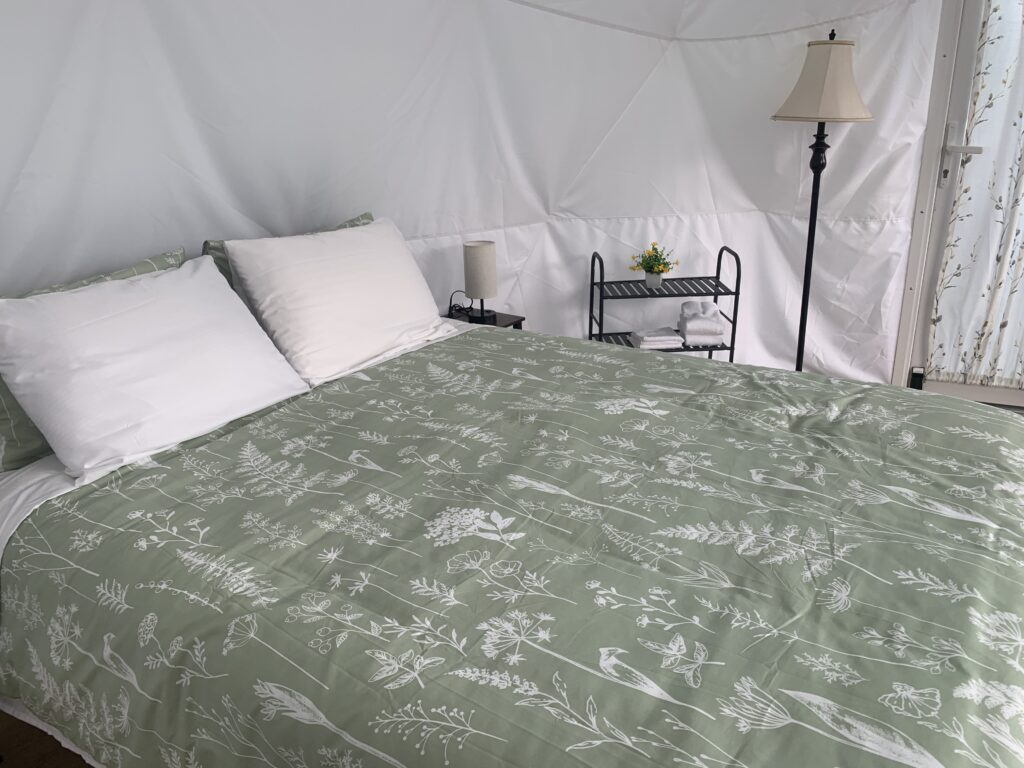 While you’re surrounded by the beauty of nature, you won’t have to sacrifice comfort. Your glamping tent comes with modern amenities, including electricity, a Keurig coffee maker, multiple phone charging stations a mini-fridge and more.. It’s the perfect blend of convenience and wilderness.